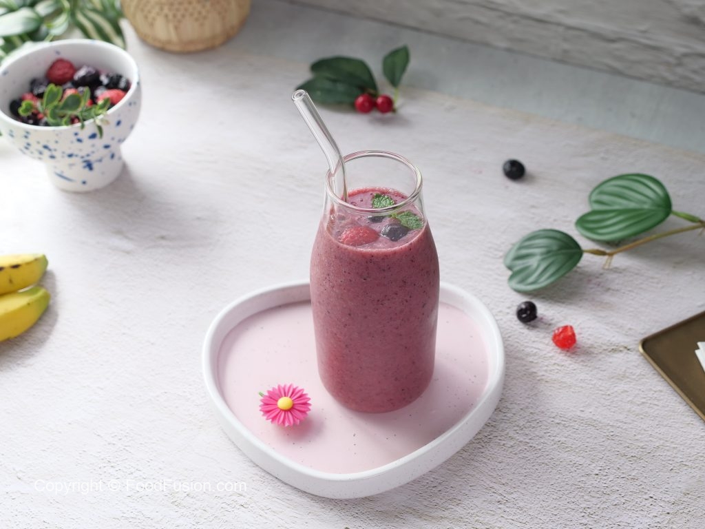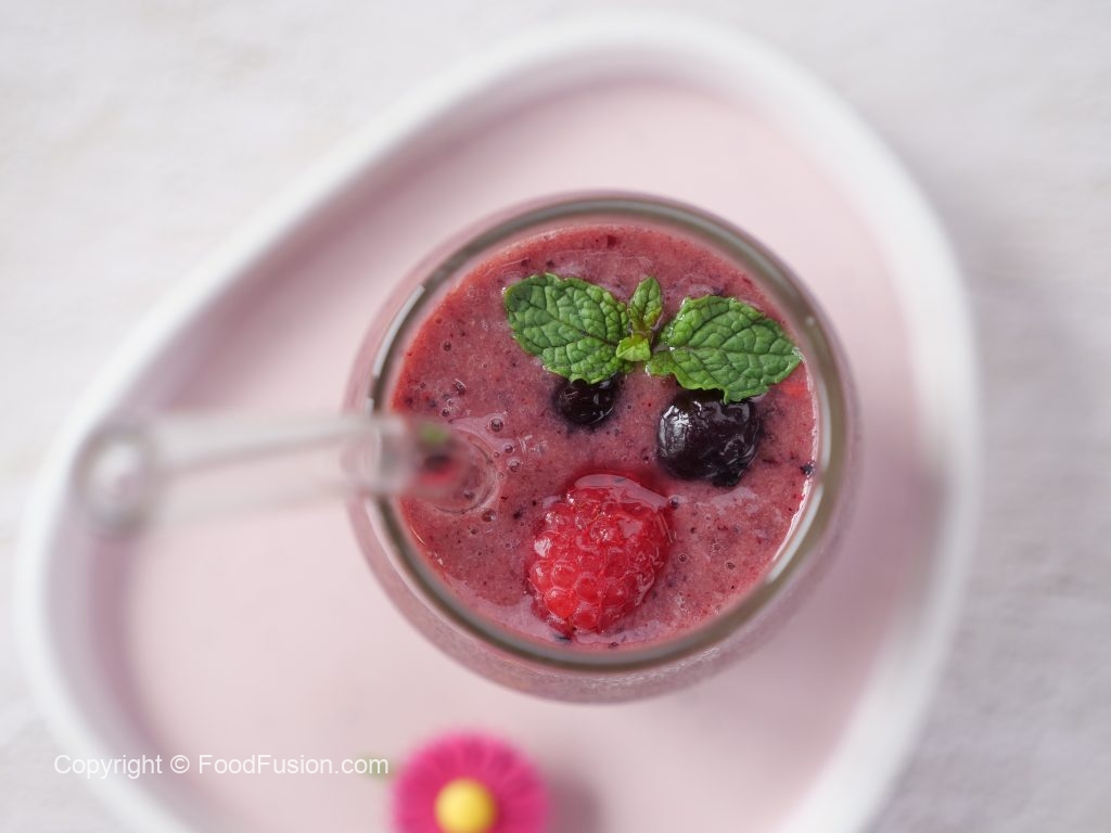 -In serving glass,add prepared smoothie & garnish with frozen berries,mint leaves & serve!