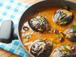 Take egg plants,make 4 small cuts in the eggplant but don’t separate them and keep them intact, including the stem,sprinkle salt and stuffed with ground spice mixture & set aside.