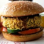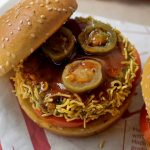 On a burger bun,add & spread green chilli sauce,add tomato,cucumber,fried patty,jalapeno slices & drizzle tamarind sauce.