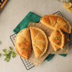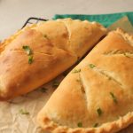 -On baking try (greased with cooking oil and lined with butter paper),place rolled dough,on half side of the dough,add chicken filling,apply water and fold the other side over it,press and apply water and seal the edges.