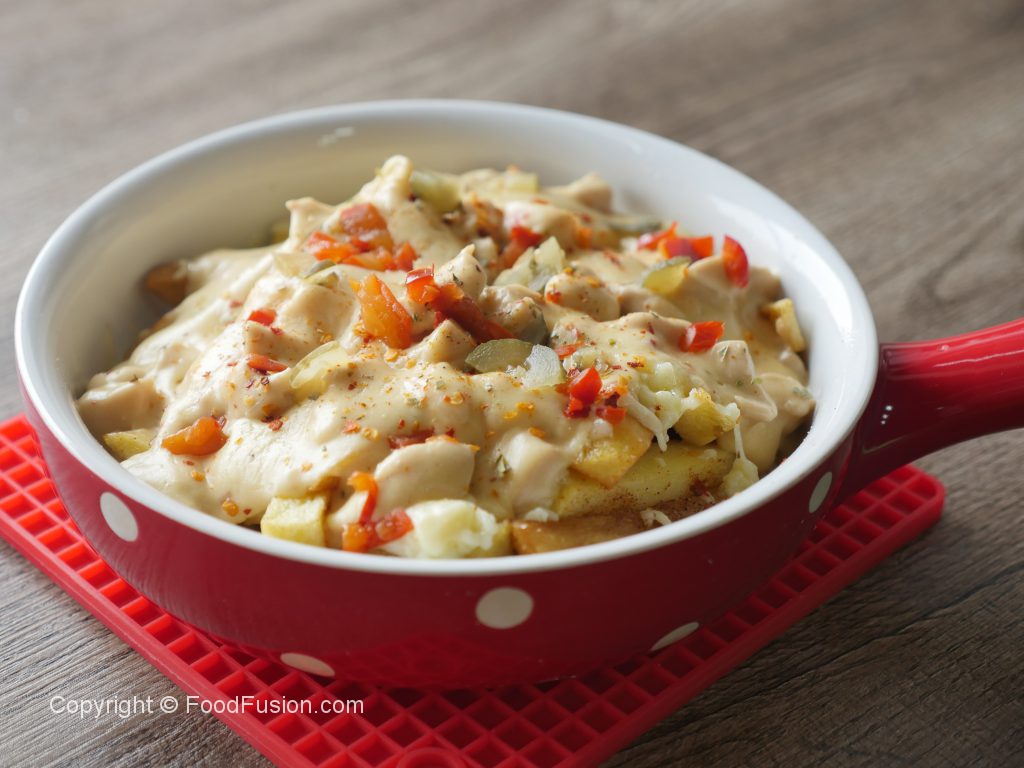 Serving platter mein potato fries aur tayyar seasoning dal ker ache tarhan mix karein phir mozzarella cheese,red jalapenos pepper,pickled cucumber,tayyar white sauce,lal mirch crushed,dried oregano,red jalapenos pepper aur pickled cucumber dal dein & serve karein!