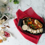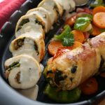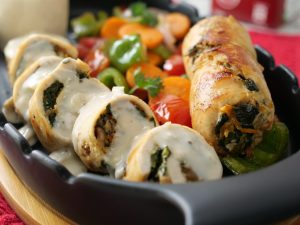Drizzle cheese mushroom sauce on chicken roulades & serve with grilled vegetables & cheese sauce!