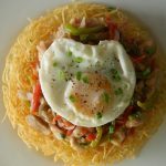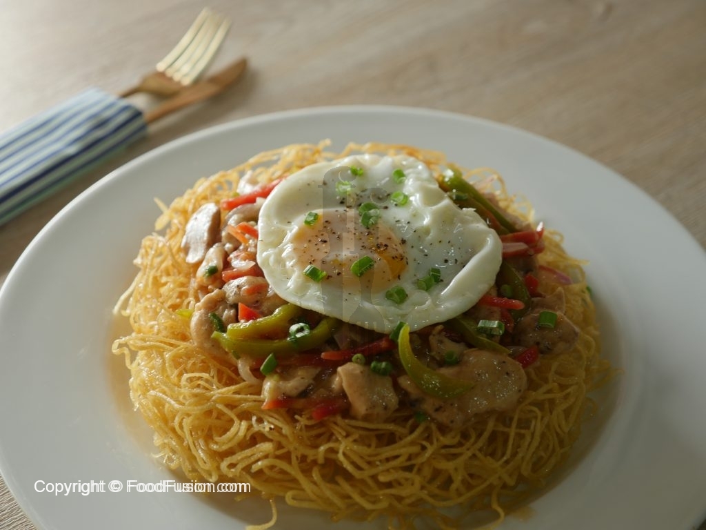 On serving place,place crispy fried noodles,chicken with sauce,fried egg,black pepper crushed,green onion & serve.
