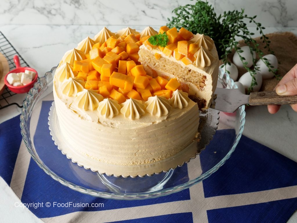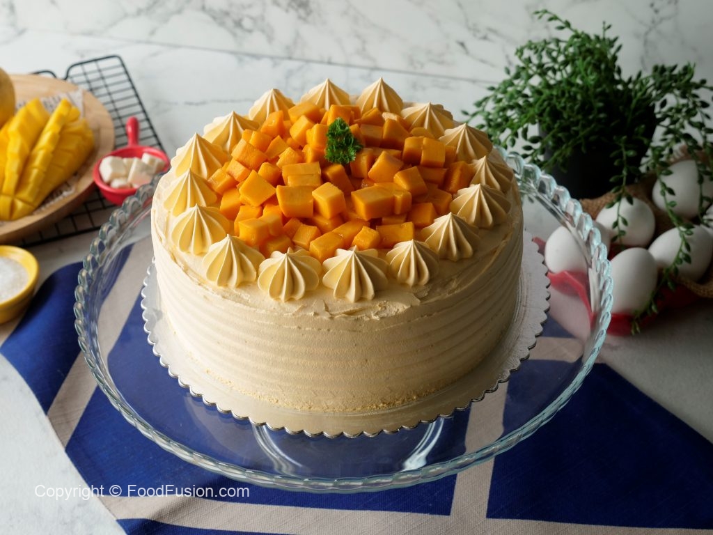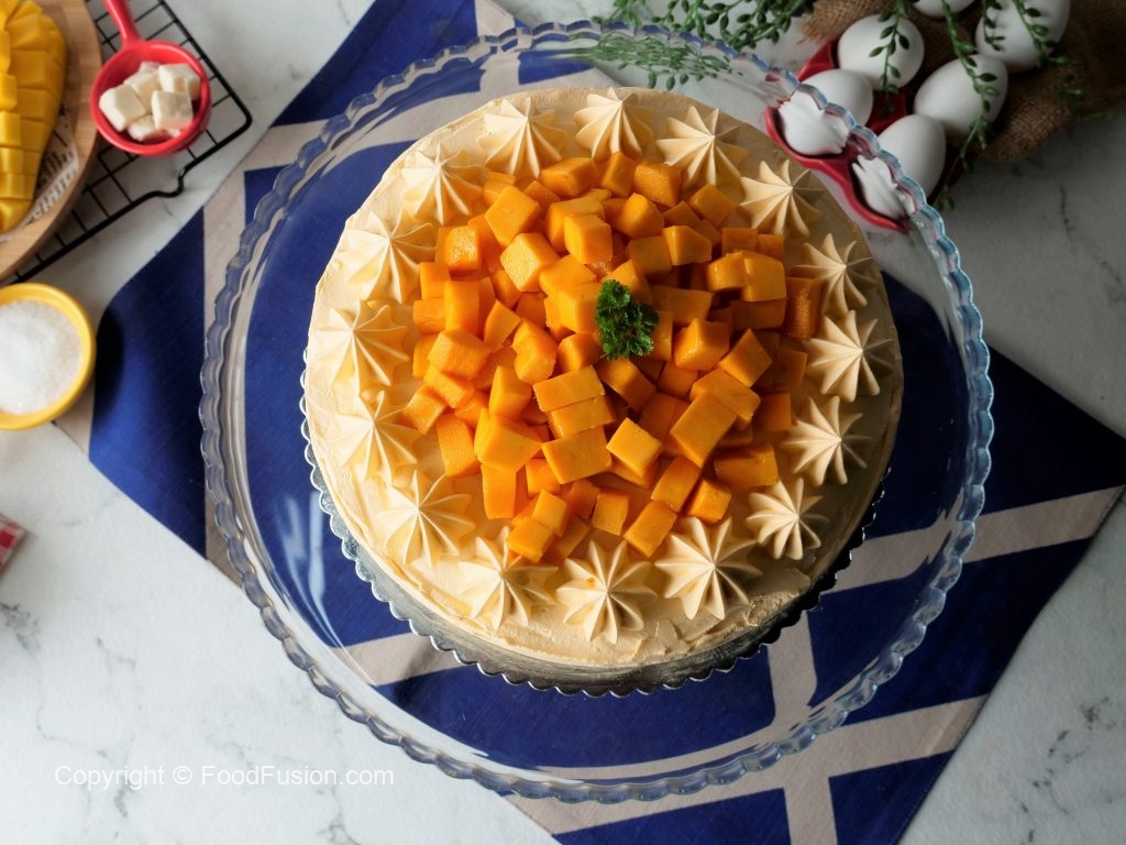 Sponge cake ki base per mango puree aur mango frosting dal ker pheela lein aur mango cubes dal dein,mango frosting dal ker upper sa cake ki top layer rakh ker gently press ker lein.