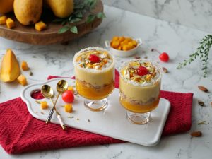 -Now add reserved mango puree,balushahi (crush with the help of hand),prepared mango rabri, mango chunks & garnish with cream,pistachios,almonds,cherry & serve chilled!