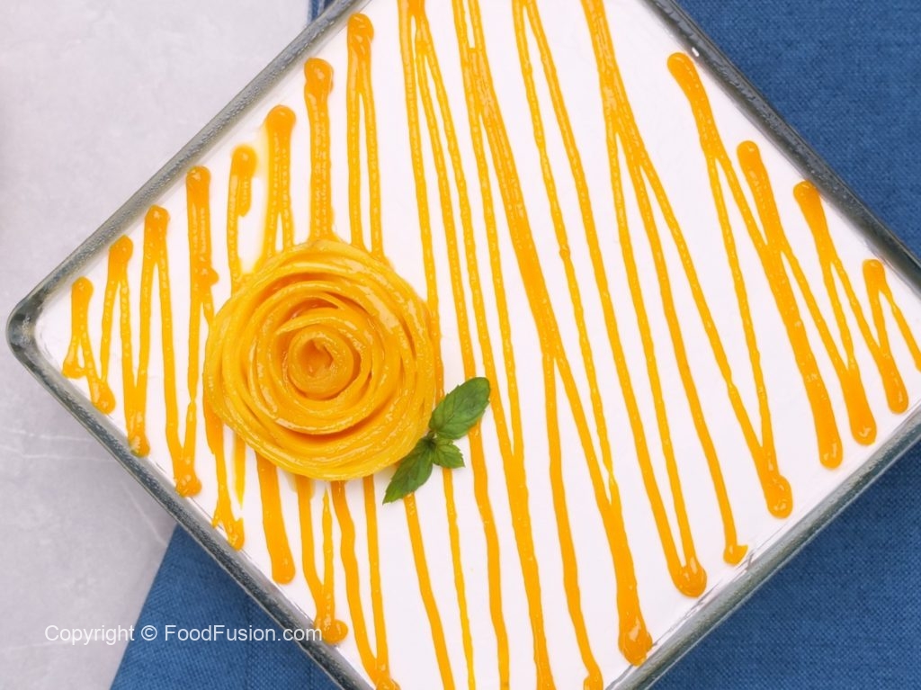 -Poke holes with the help of fork or skewer,pour prepared mango milk syrup & let it absorb completely (add more syrup if required).