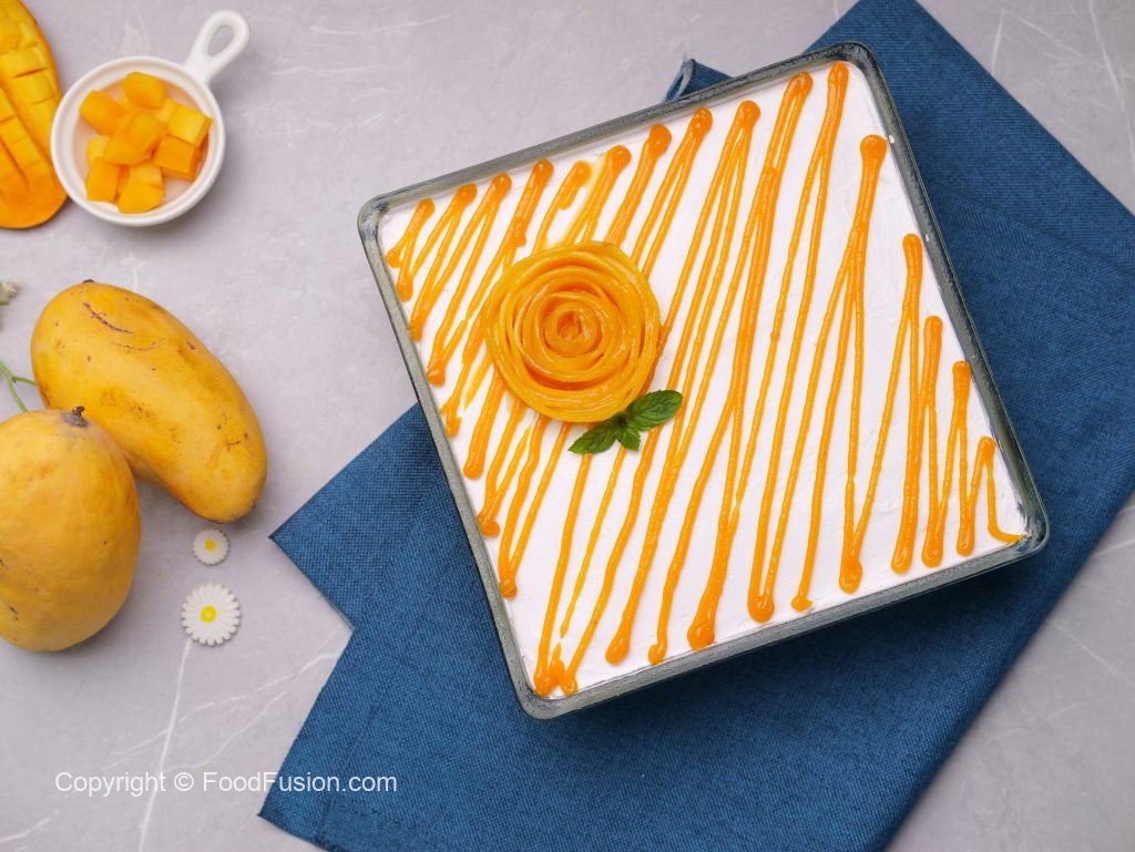 -In a jug,add cooked mango puree (1 Cup),cream,condensed milk,milk,whisk well & set aside.