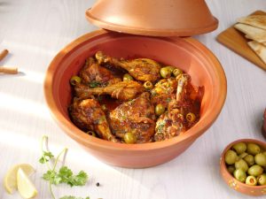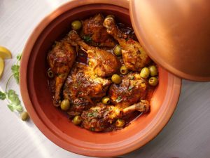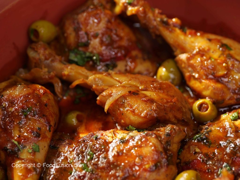 -Add onion,garlic,pickled lemon (chopped),tomato pureed,fresh parsley,dissolved saffron,chicken stock,cover & cook on low flame for 25-30 minutes.