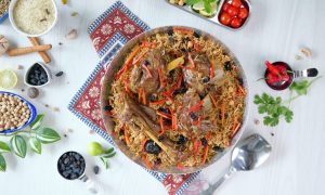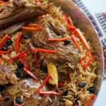 -Add 2 tbs of prepared bukhari spice mix,pink salt,mix well & cook on high flame until 1 cup of stock is left (4-5 minutes),add carrots & black raisins,chickpeas,place cooked mutton pieces & cover with kitchen cloth & lid.