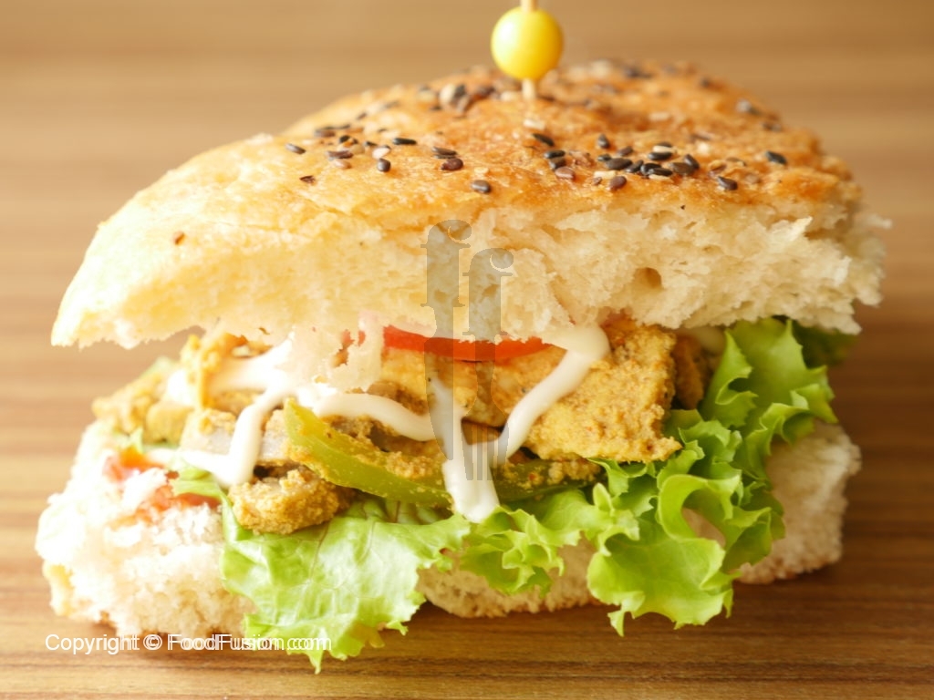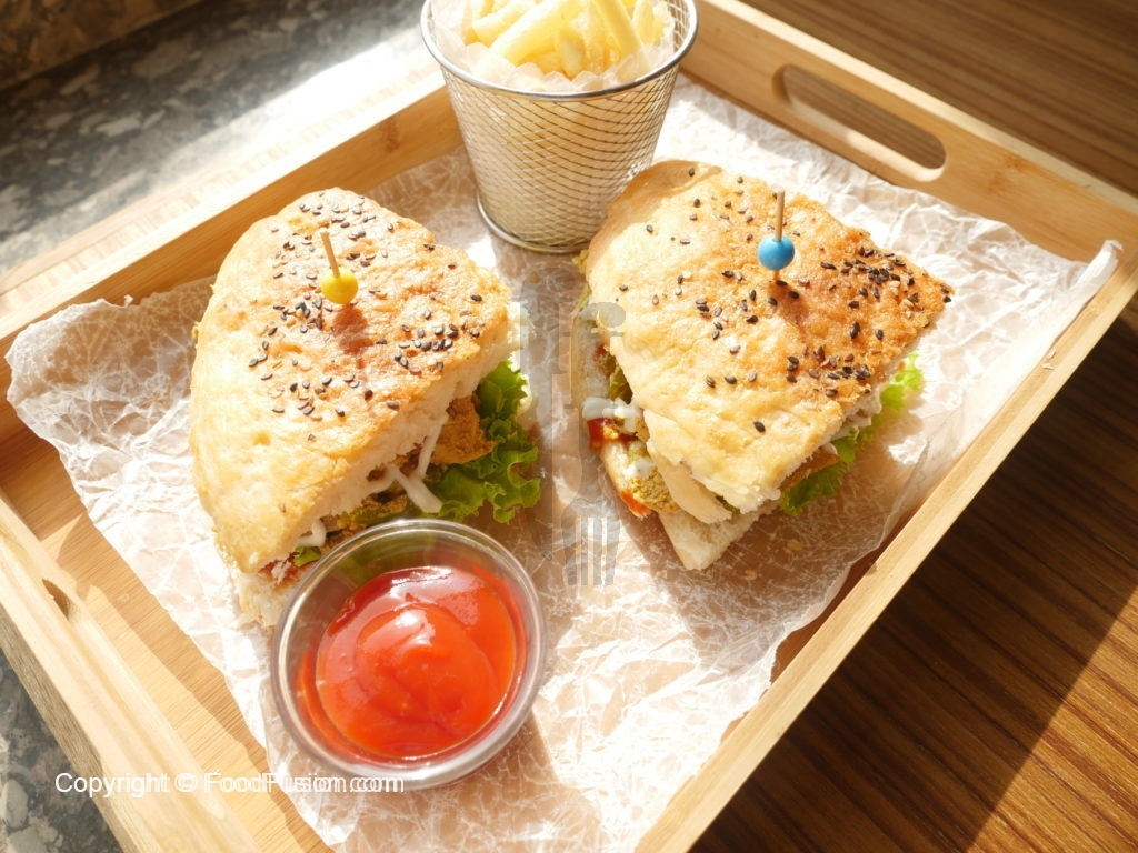 Cut naan into four pieces,add tomato ketchup,salad leaf,chicken filling,tomato,onion,mayonnaise and cover with top bun & serve.