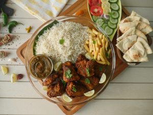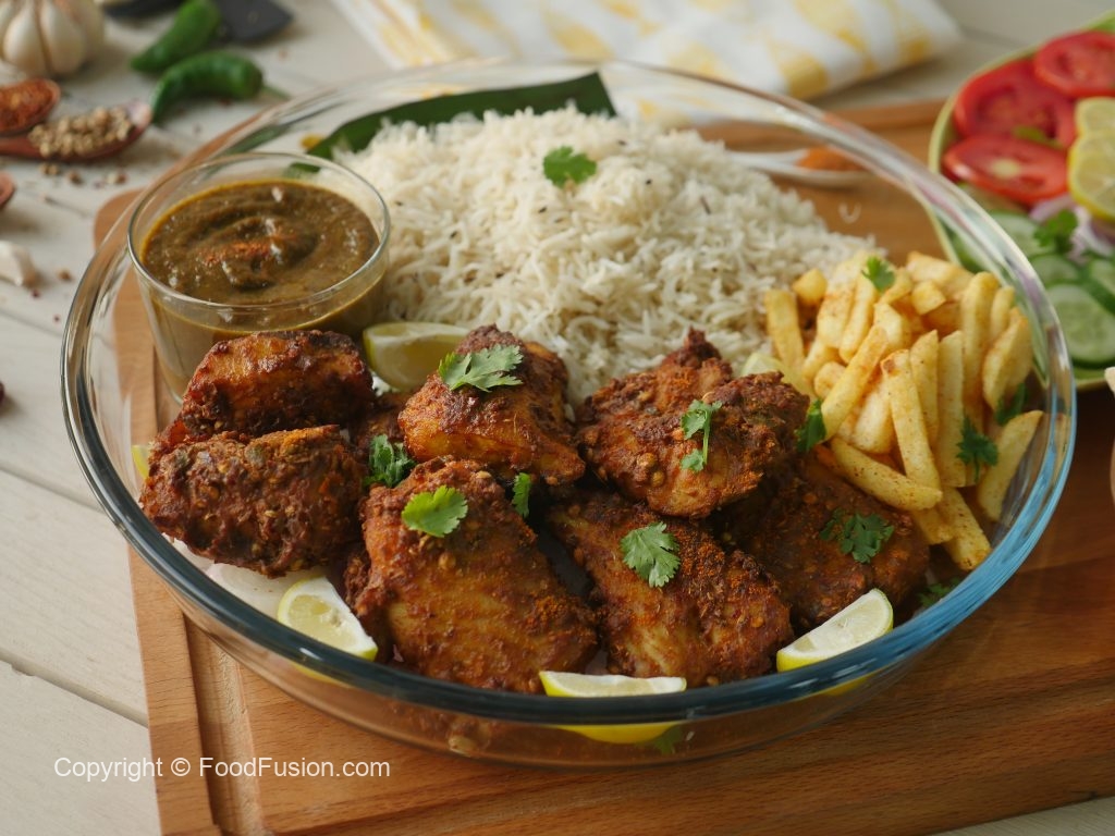 Serve fried fish with zeera rice,potato fries/chips,onion rings and prepared tamarind mint sauce.