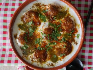 In serving dish,add steam dumplings,yogurt,date tamarind chutney,green chutney and sprinkle red chili crushed,cumin seeds,salt,fresh coriander & serve.