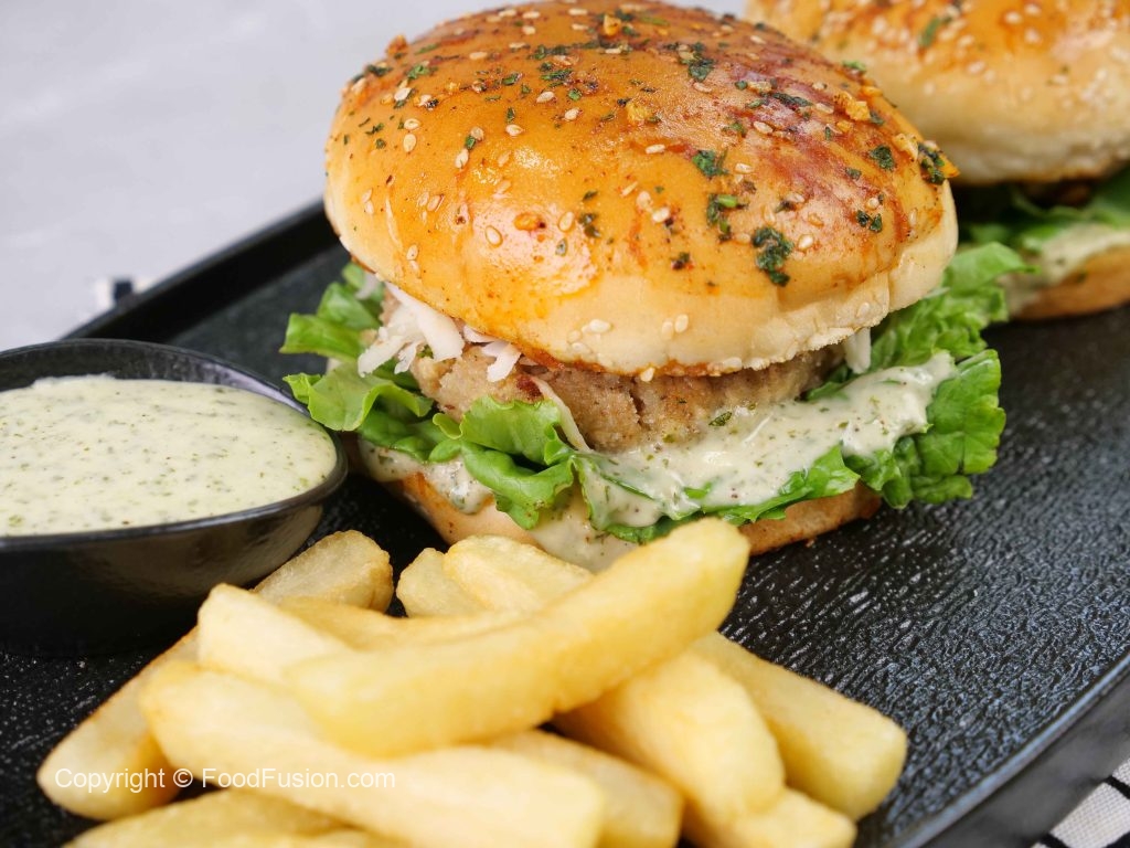 -On burger bun,add & spread prepared burger sauce,salad leaf,fried patty with cheese,tomato ketchup & cover with top bun to make a burger.
