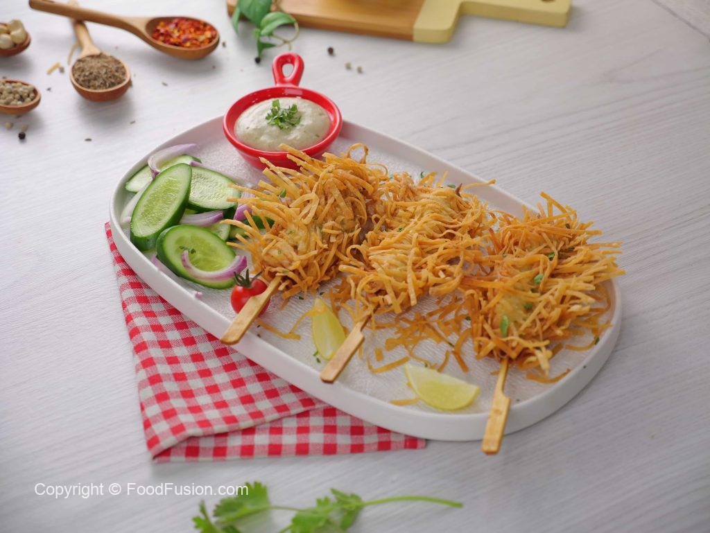 -In a wok, heat cooking oil (140 C) & deep fry skewers on low flame until golden & crispy (10-12 minutes).